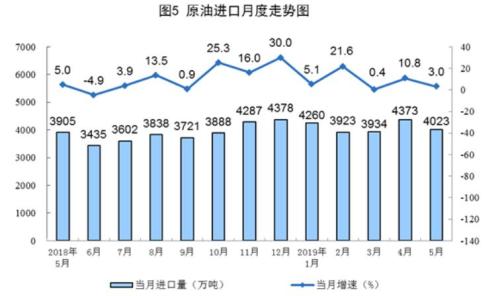 5月份,進(jìn)口原油4023萬(wàn)噸,同比增長(zhǎng)3.0%,增速較上月回落7.8個(gè)百分點(diǎn);1—5月份,進(jìn)口原油20513萬(wàn)噸,同比增長(zhǎng)7.7%。