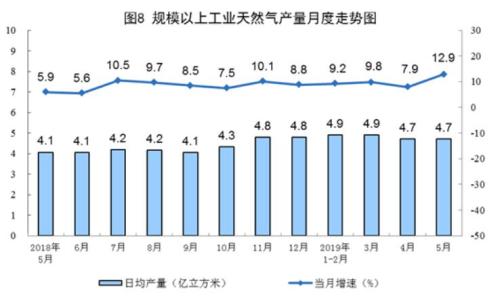5月份,生產(chǎn)天然氣144億立方米,同比增長(zhǎng)12.9%,增速比上月加快5.0個(gè)百分點(diǎn);日均產(chǎn)量4.7億立方米,與上月持平。1—5月份,生產(chǎn)天然氣725億立方米,同比增長(zhǎng)9.8%。