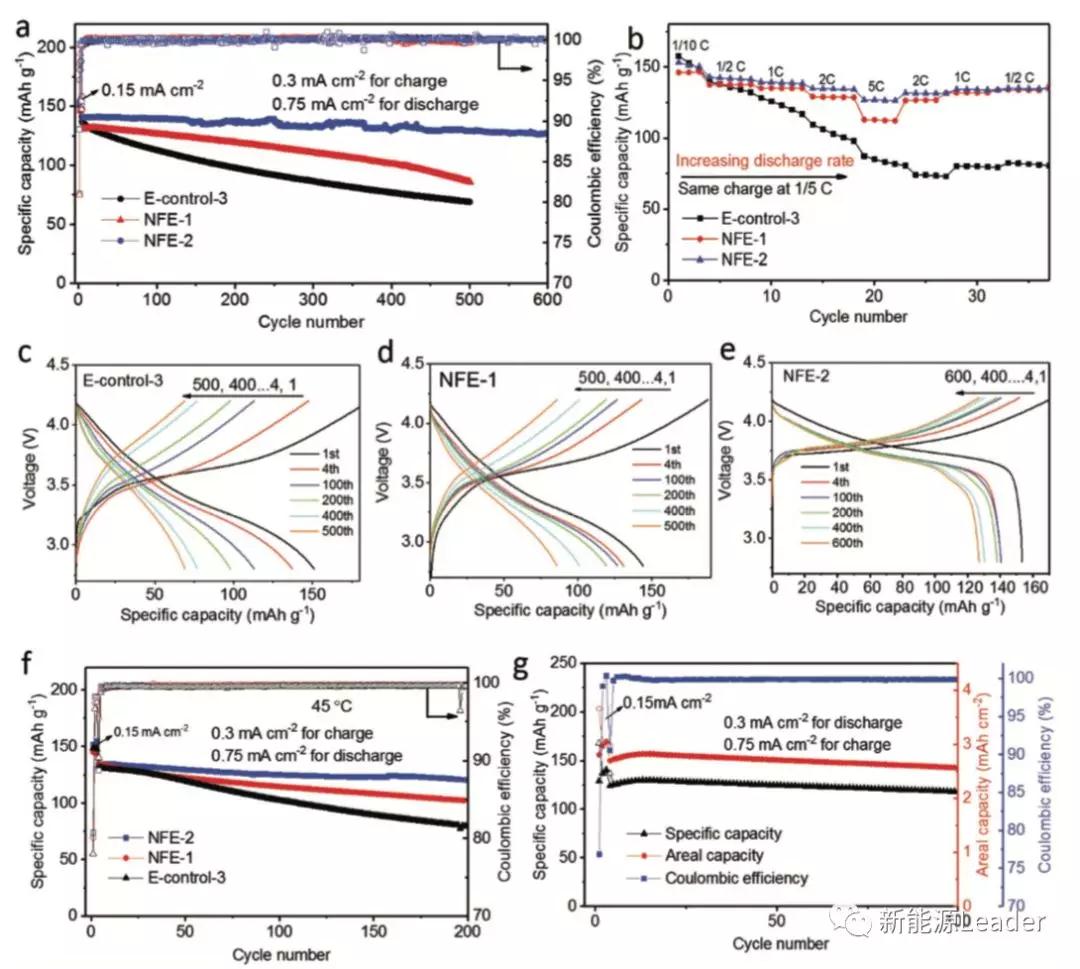 為了驗證局部稀釋電解液在全電池中的效果,作者采用NCM333作為正極,Si/石墨作為負極制作了全電池,并分別注入E-control-3、NFE-1和NFE-2三種電解液,從下圖a中能夠看到對于這三種電池,在初始時正極容量發(fā)揮都在150mAh/g左右,屬于NCM333材料的正常容量發(fā)揮,但是在循環(huán)中三種電池表現(xiàn)出了明顯的差距,其中NFE-2對循環(huán)性能最好,循環(huán)600次后容量保持率仍然可達89.8%,其次是NFE-1,循環(huán)500次后容量保持率為65.7%,最差的E-control-3,循環(huán)500次后容量保持率僅為50.3%,同時我們從下圖c-e三種電解液的充放電曲線,從圖中能夠看到普通電解液隨著循環(huán)的進行電池的極化也在明顯增加,而NFE-1電解液的極化增加明顯減少,NFE-2電解液循環(huán)過程中的極化增加是最少的,這也表明了NFE-2電解液能夠更好的改善鋰離子電池的界面穩(wěn)定性。兩款局部稀釋電解液不僅循環(huán)性能十分優(yōu)異,而且在倍率性能測試中也表現(xiàn)出了非常好的性能(下圖b所示)。高溫測試往往會加劇鋰離子電池的容量衰降速度,這主要是與高溫加劇了界面反應有關,而NFE-2電解液良好的穩(wěn)定性,使得電池即便是45℃下循環(huán)仍然保持了良好的循環(huán)性能(下圖f)。