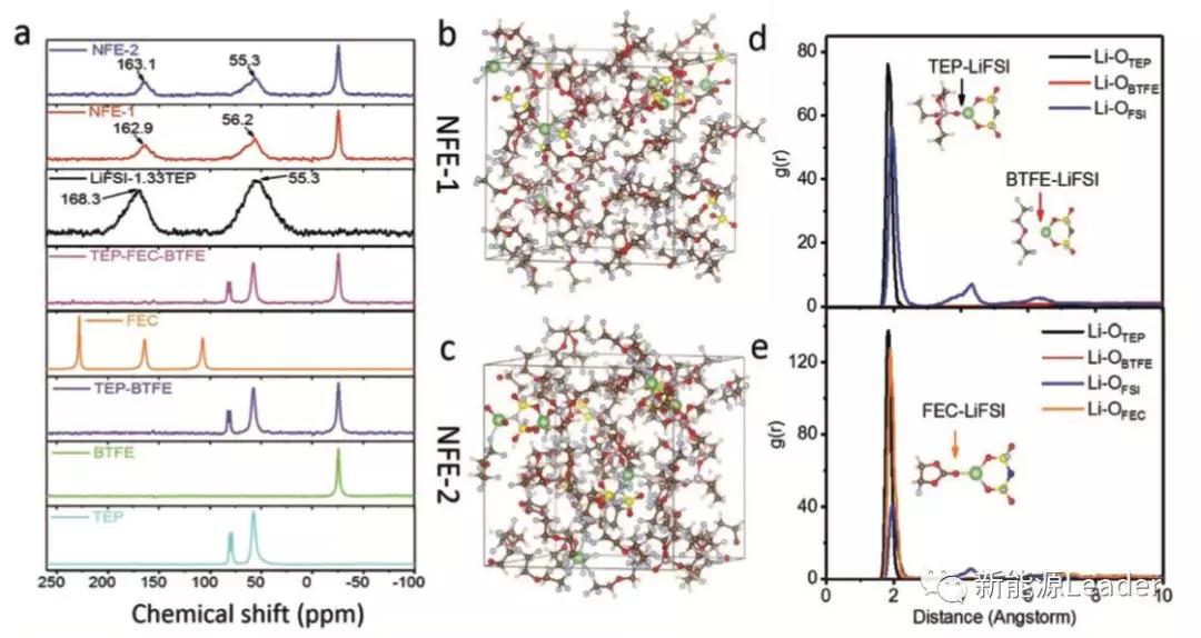 為了分析局部稀釋電解液提升鋰離子電池性能的原因,作者采用氧原子核磁共振的方式對局部稀釋高濃度電解液的溶液結構進行了分析,從下圖a能夠看到在高濃度電解液的核磁共振圖譜上TEP的峰明顯變寬,并且未見到明顯的自由態(tài)TEP分子,表明溶液中大部分的TEP都與Li+形成了溶劑化結構,而在溶液中加入BTFE后并沒有對Li+-TEP結構產(chǎn)生明顯的影響,表明BTFE在加入后雖然在宏觀上對電解液進行了稀釋,但是實際上在微觀結構上電解液仍然維持了高濃度電解液的結構特點。
