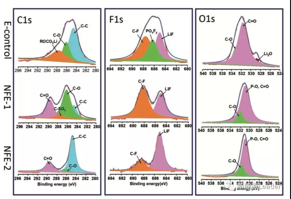 電解液不僅會在負極表面得到電子發(fā)生還原分解,還會在正極表面失去電子發(fā)生氧化分解,從下圖正極的XPS結果中我們能夠看到,在O1s圖中我們看到E-control-3電解液中我們在正極表面觀察到了M-O鍵,表明對照組的碳酸酯類電解液不會在正極表明形成鈍化層,而在NFE-1和NFE-2電解液中的正極表面的M-O鍵強度顯著降低,直至消失,表明NFE電解液能夠在正極表面形成一層鈍化層,減少電解液對正極的侵蝕。