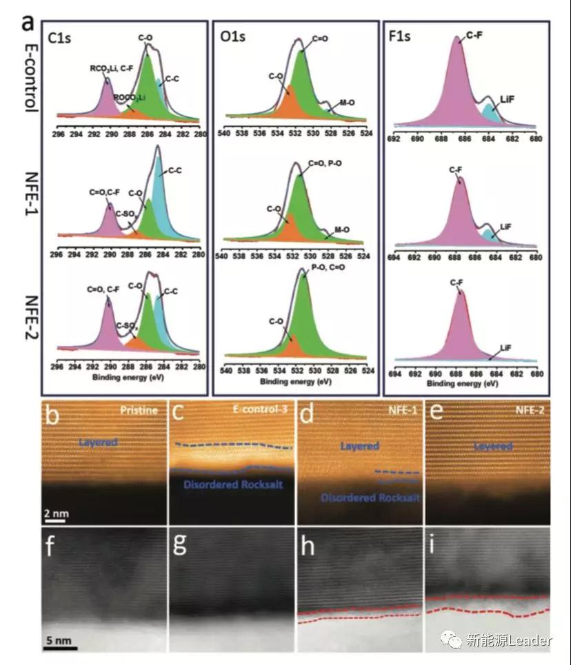 電解液對于正極的保護作用,我們也可以從正極材料的結構變化中看出,從下圖的透射電鏡圖片可以看到,在E-control-3電解液中的NCM333在50次循環(huán)后電極顆粒表面明顯的觀察到了無序結構層和巖鹽結構相,這可能是由于電解液中的HF等成分對于材料的侵蝕造成的。而在NFE-1電解液中的NCM333材料顆;颈3至藢訝罱Y構,只有少量的巖鹽結構相,而添加2%FEC的NFE-2電解液中的NCM333材料則完全保留了層狀結構,未見到巖鹽結構相,同時在顆粒的表面也觀察到了1.5-3nm厚的保護層。這表明NFE-2電解液能夠在正極表面形成良好的表面惰性層,從而實現(xiàn)對于NCM333正極的保護。