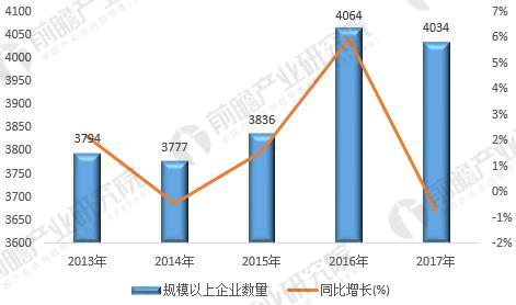 圖表4:2013-2017年中國電線電纜行業(yè)規(guī)模以上企業(yè)數(shù)量(單位:家,%)
