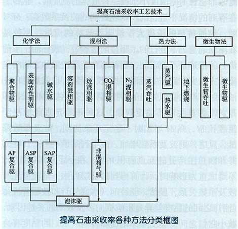 從傳統(tǒng)意義上講,除注水保持油藏壓力以外,作為油田應(yīng)用的提高石油采收率主要技術(shù)如圖所列舉。其中包括:(1)化學(xué)驅(qū)油技術(shù)(表面活性劑驅(qū)、聚合物驅(qū)、 堿水驅(qū)、 泡沫驅(qū)、化學(xué)復(fù)合驅(qū)等);(2)氣混相和非 混相驅(qū)油技術(shù)(烴混相驅(qū)、二氧化碳驅(qū)、氮氣驅(qū)、 煙道氣驅(qū)、非混相氣驅(qū)、氣水交替驅(qū)和混氣水驅(qū)等);(3)熱力采油技術(shù)(蒸汽驅(qū)、蒸汽吞吐、熱水驅(qū)、火燒油層等);(4)微生物采油技術(shù)(微生物驅(qū)、微生物吞吐等);(5)物理采油技術(shù)(波動采油技術(shù)、注磁化水驅(qū)油等);(6)特殊油田開采技術(shù)(露天開采等)。從廣義上講,還包括油井層內(nèi)深部堵水、水井調(diào)整吸水剖面和油層深部改變水流方向、增加滲濾面積的水平井技術(shù)等也常列入油田提高石油采收率(或改善石油采收率)技術(shù)范圍。
